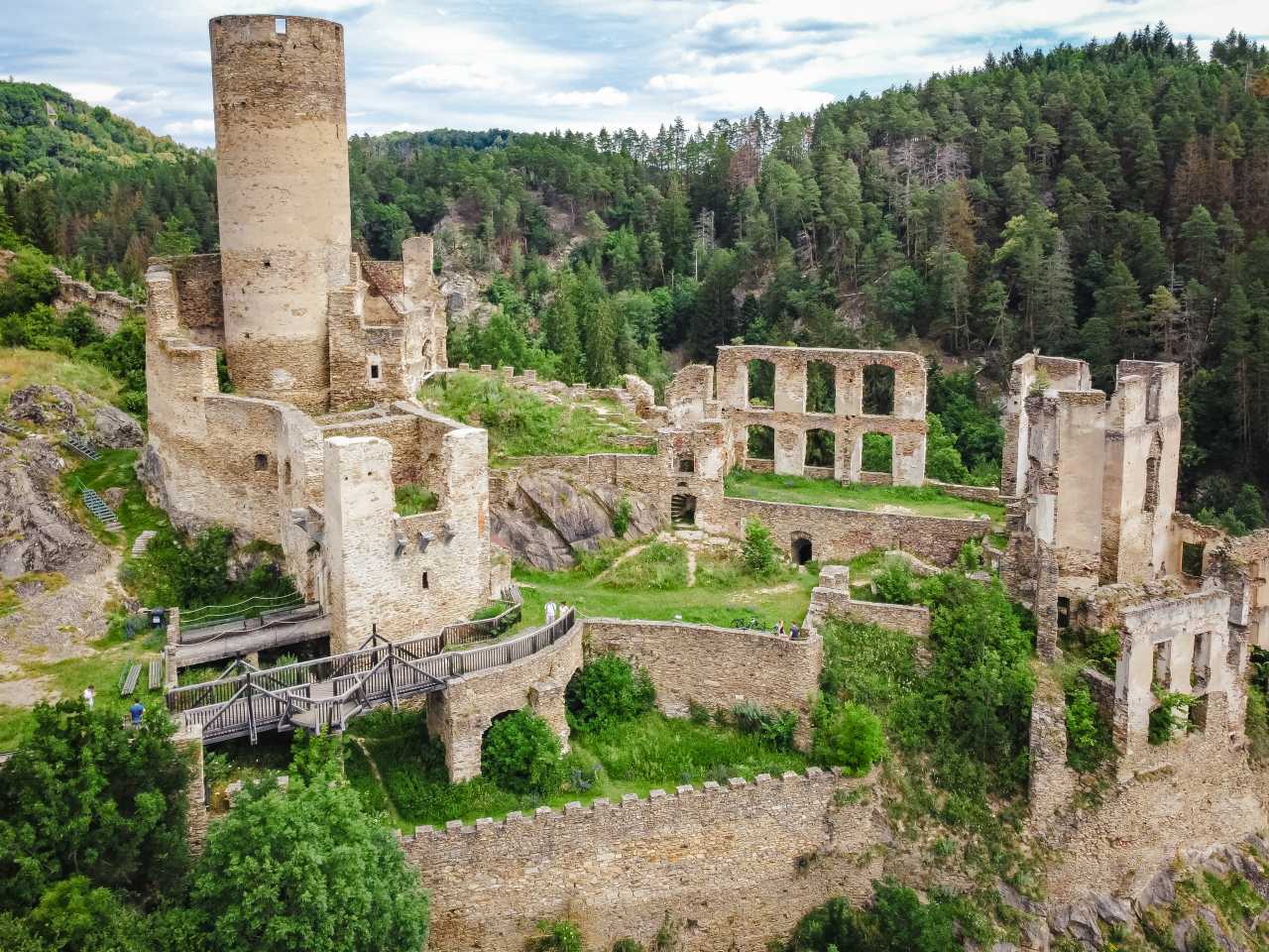Die zyklopischen Mauern mit zwei runden Ecktürmen sind die Reste einer der größten, einst weitläufigen, mittelalterlichen, bedeutendsten Burganlagen Niederösterreichs. Der halbkreisförmige Torturm mit Spitzbogentor, der Hungerturm, der Bergfried und Reste eines zweigeschoßigen Wohngebäudes sowie verschiedener anderer Bauteile sind erhalten. Im Nordwesten erhebt sich die um 1450 gegen Georg von Podiebrad erbaute, etwa 110 Meter lange sogenannte Böhmische Mauer, die der Burg in einer Entfernung von etwa 300 Metern vorgelagert ist.