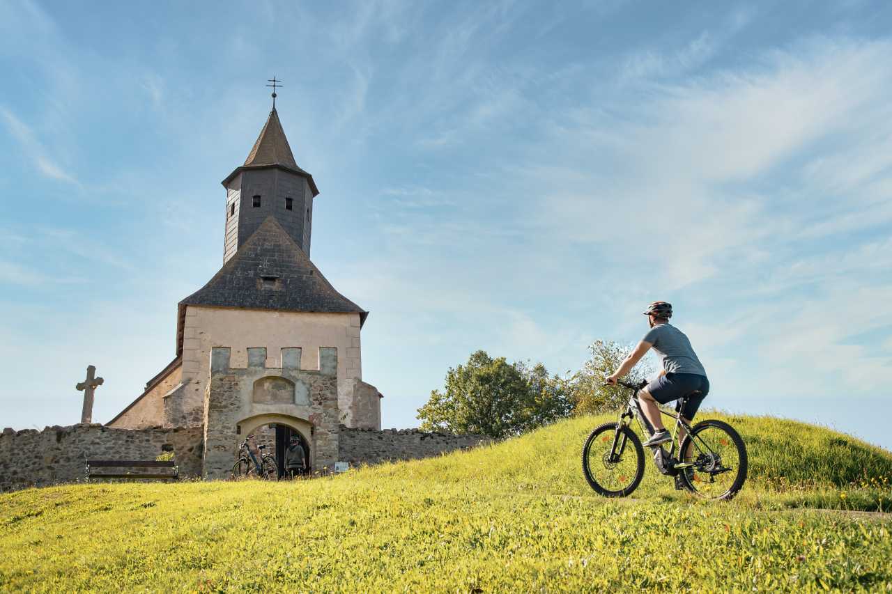 Der Kirchhof mit einem östlichen Zugang war ursprünglich durch einen vorgelagerten Erdwall und ehemaligen Graben zusätzlich gesichert. Der vorspringende etwas erhöhte und hinten offene rechteckige Torturm besteht aus Bruchsteinmauerwerk mit einem Zinnenabschluss aus dem 15. Jahrhundert, seitlich des rundbogigen Tores sind noch Spuren eines Windenfalzes der ehemaligen Zugbrücke erkennbar. Im Westen bestand gegen das ansteigende Gelände durch einen halbkreisförmigen Erdwall mit einem Halsgraben ein weiterer Schutz. Unterhalb der Kirche sind Reste eines Erdstalls erhalten welcher aber nicht öffentlich zugänglich ist. Ein Video dazu (auf Deutsch) finden sie hier: https://www.youtube.com/watch?v=fev_i7HTxxw